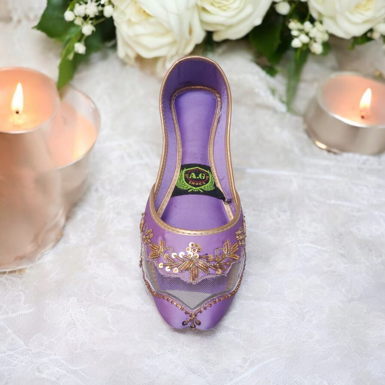 Step into timeless elegance with this stunning net jutti, beautifully handcrafted with golden embroidery and delicate beadwork. Designed for modern women who appreciate tradition, this jutti combines royal charm with comfort. The soft inner lining and sleek silhouette make it perfect for weddings, festive occasions, or everyday ethnic wear.