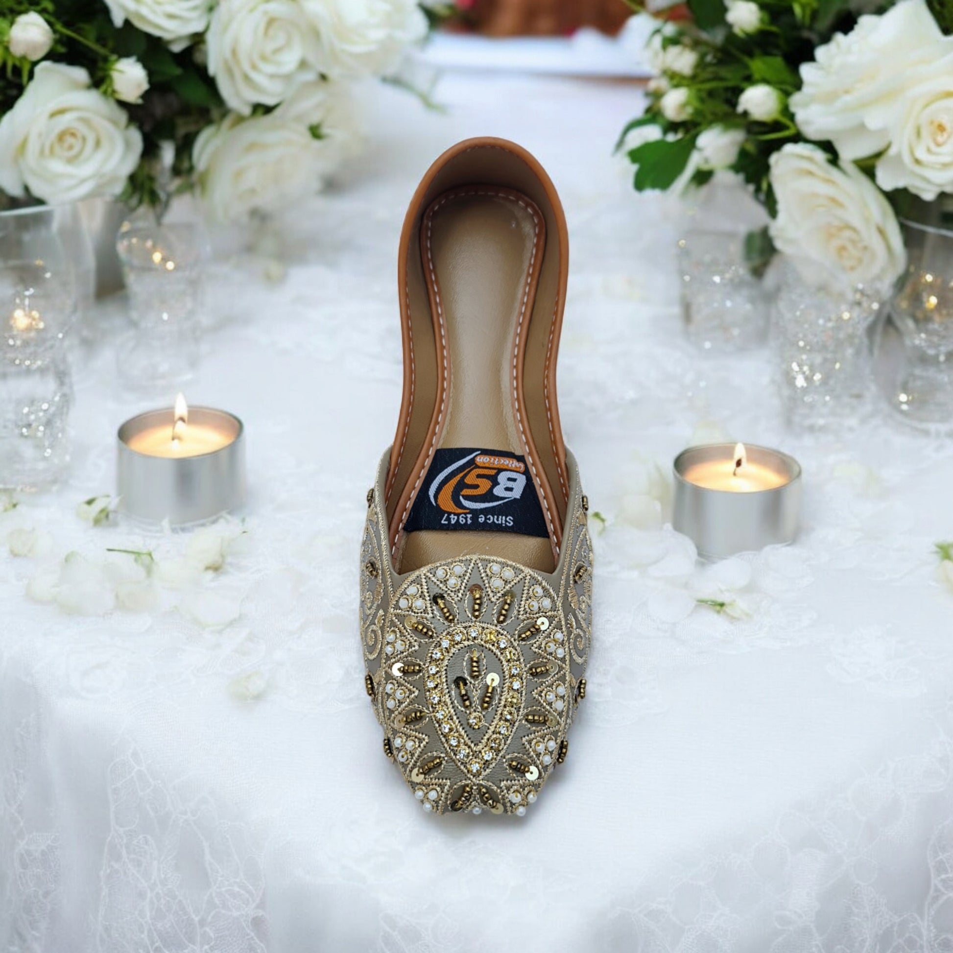 Elevate your bridal or festive look with this exquisite pair of gold embroidered khussa shoes from BS Collection. Expertly handcrafted, these traditional juttis feature intricate gold zari and beadwork on a neutral base, making them the perfect complement to lehengas, sarees, or formal ethnic wear. The soft leather lining and cushioned insole ensure both style and all-day comfort. Set in a luxurious wedding-themed backdrop with candles and roses, these shoes are a timeless statement piece for any celebration.