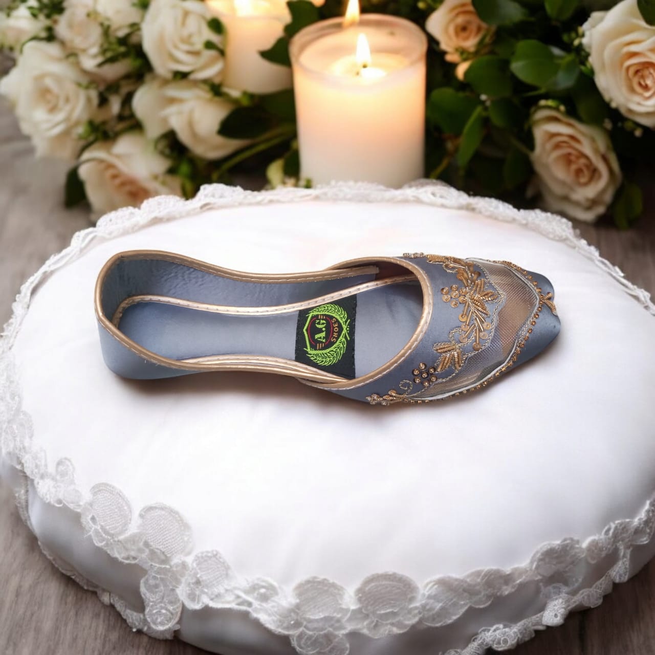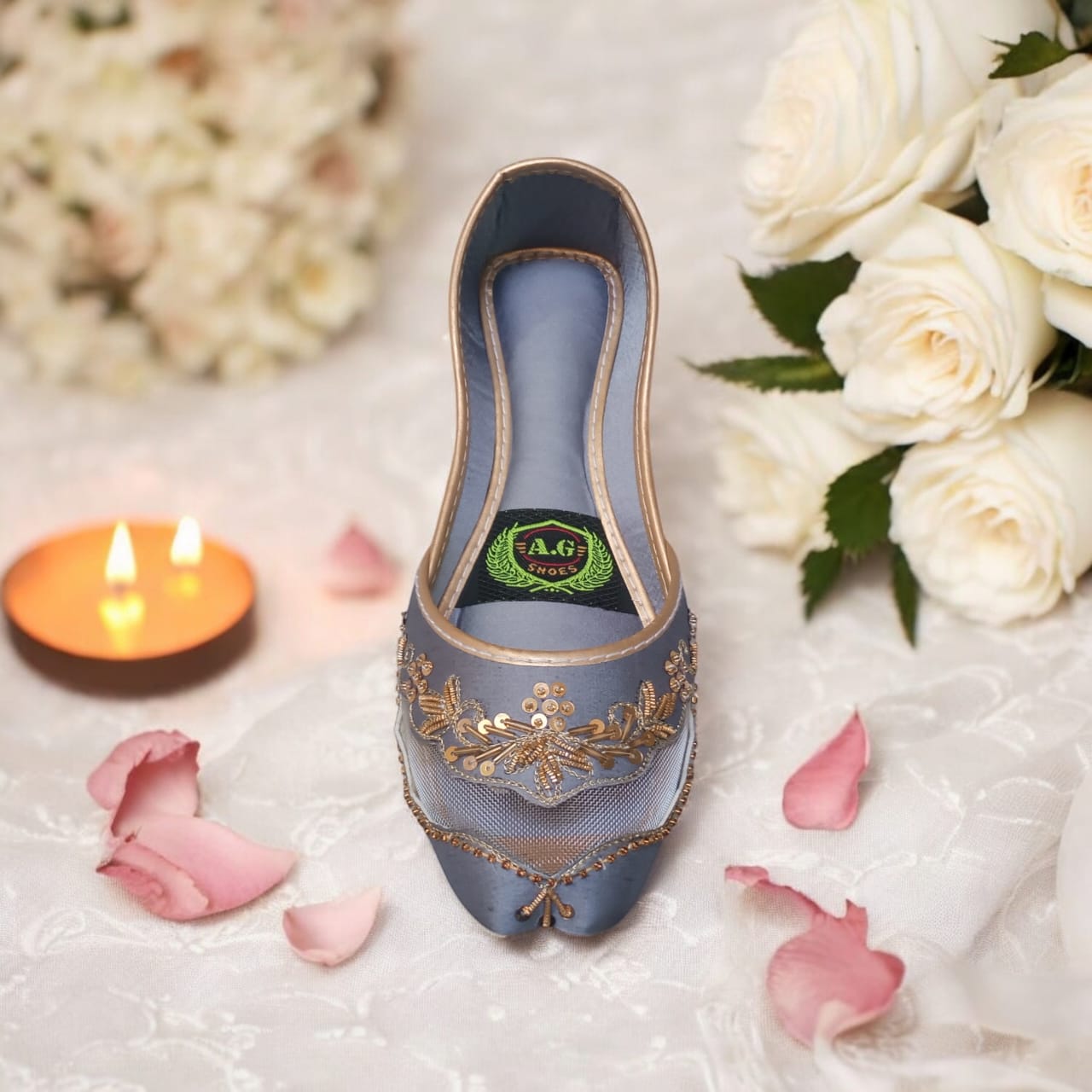 Step into timeless elegance with this stunning grey net jutti, beautifully handcrafted with golden embroidery and delicate beadwork. Designed for modern women who appreciate tradition, this jutti combines royal charm with comfort. The soft inner lining and sleek silhouette make it perfect for weddings, festive occasions, or everyday ethnic wear.