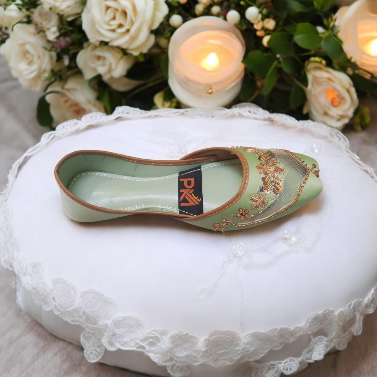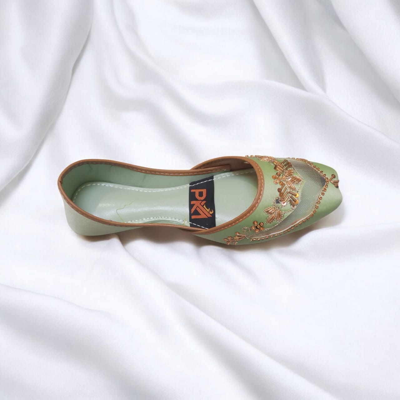 Embrace fresh elegance with this beautiful mint green net jutti, expertly handcrafted with golden embroidery and delicate beadwork. Perfect for those who love subtle yet sophisticated style, this jutti blends refreshing color with traditional artistry and comfortable wear. The soft inner lining and sleek silhouette make it ideal for weddings, festive occasions, or everyday ethnic wear.